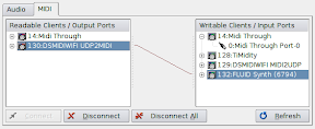 -En aquest cas, repetim el procés, però un cop engegat qsynth, connectem el port de sortida MIDI DSMIDIWIFI UDP2MIDI al port d'entrada MIDI de qsynth :